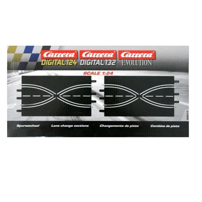 Als u uw Carrera-racebaan uitrust met dit rijstrookwisselgedeelte, kunt u op een coole en ongedwongen manier van rijbaan wisselen. De baan op het baanelement is S-vormig, waardoor het een echte blikvanger wordt wanneer de Carrera slotcars van baan wisselen. Met het baanelement kunt u uw creativiteit de vrije loop laten. Vooral als je meerdere rijstrookwisselbanen achter elkaar installeert, ontstaat er in een handomdraai een cool baanvak, waar je keer op keer doorheen kunt rijden. De rijstrookwisselbaan op schaal 1:24 bestaat uit twee delen met elk een lengte van 345 mm. U kunt de rijbaanwissel gebruiken voor uw Carrera DIGITAL 124, DIGITAL 132 en EVOLUTION racecircuits.